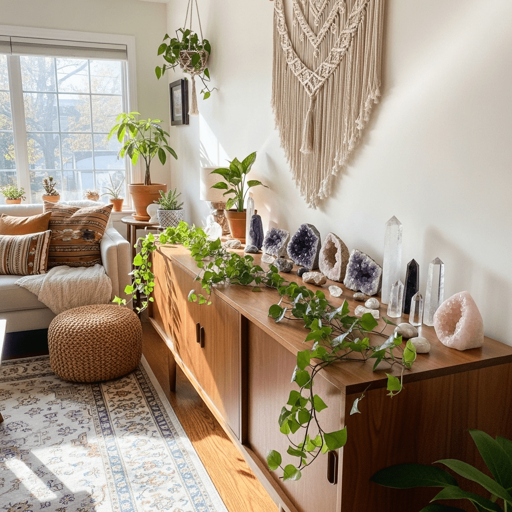 Blending the clean lines of mid-century modern furniture (like a tapered-leg sideboard) with the textures and plants of the Bohemian style.