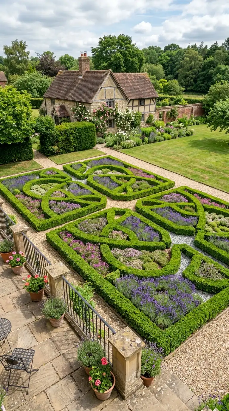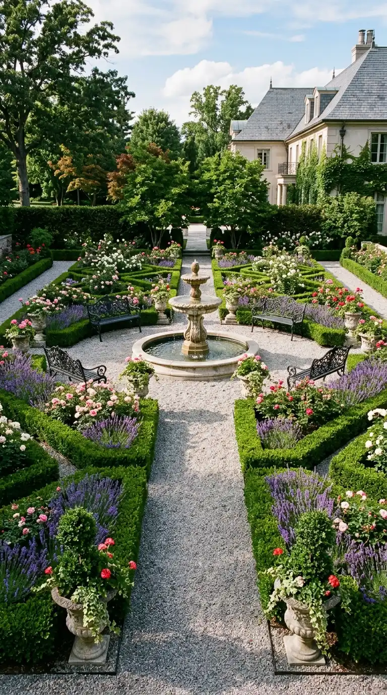 A French formal garden, or jardin à la française, is characterized by symmetry, geometric shapes, and a sense of order. Use clipped hedges, gravel pathways, and central focal points like a fountain or statue. Plant parterre beds with low hedges arranged in intricate patterns, filled with lavender, boxwood, or roses. Add a wrought iron bench and a stone urn. This design is elegant, structured, and timeless.