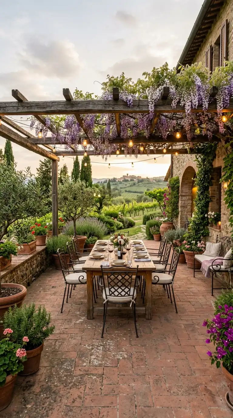 An Italian Mediterranean terrace is designed for al fresco dining and lounging. Use terracotta tiles or natural stone for flooring. Add a pergola draped with climbing vines like wisteria or grapevines. Furnish with a large wooden table, wrought iron chairs, and colorful cushions. Plant olive trees, rosemary, and lavender in terracotta pots. The atmosphere is warm, inviting, and perfect for long summer evenings.