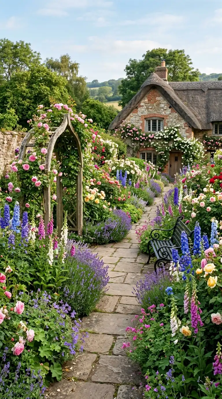 An English cottage garden embraces abundance, color, and a relaxed, informal aesthetic. Plant a mix of perennials, annuals, and flowering shrubs in layered drifts. Include classic cottage plants like roses, delphiniums, foxgloves, peonies, lavender, and hollyhocks. Allow plants to spill over stone pathways, and incorporate climbing roses on arbors and trellises. A wrought iron bench offers a spot to sit and enjoy the blooms.