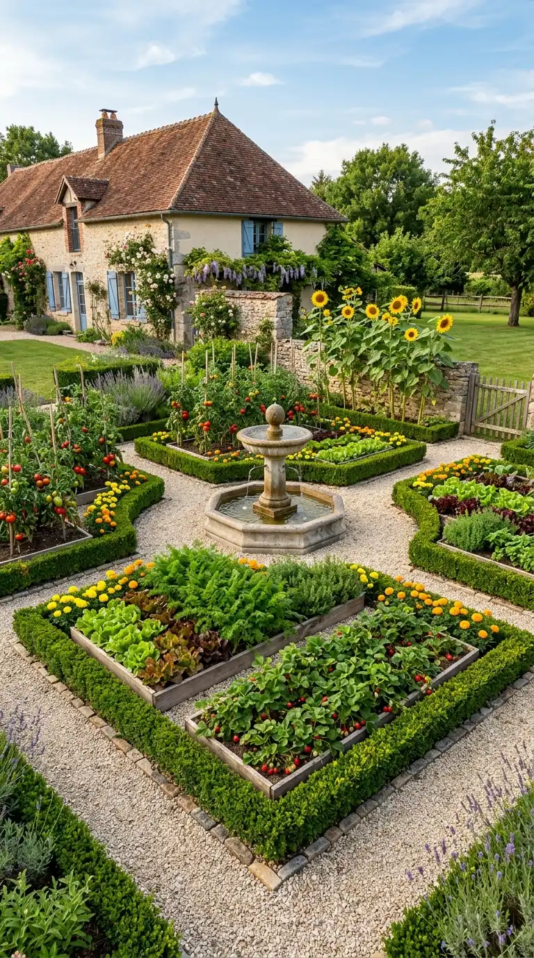 A French potager combines vegetables, fruits, flowers, and herbs in a decorative, productive layout. Use raised beds in geometric patterns, framed with low boxwood hedges or gravel pathways. Plant tomatoes, beans, lettuce, carrots, and strawberries alongside marigolds, nasturtiums, and sunflowers. Add a central focal point like a small fountain or a rustic arbor. A potager is both beautiful and practical.