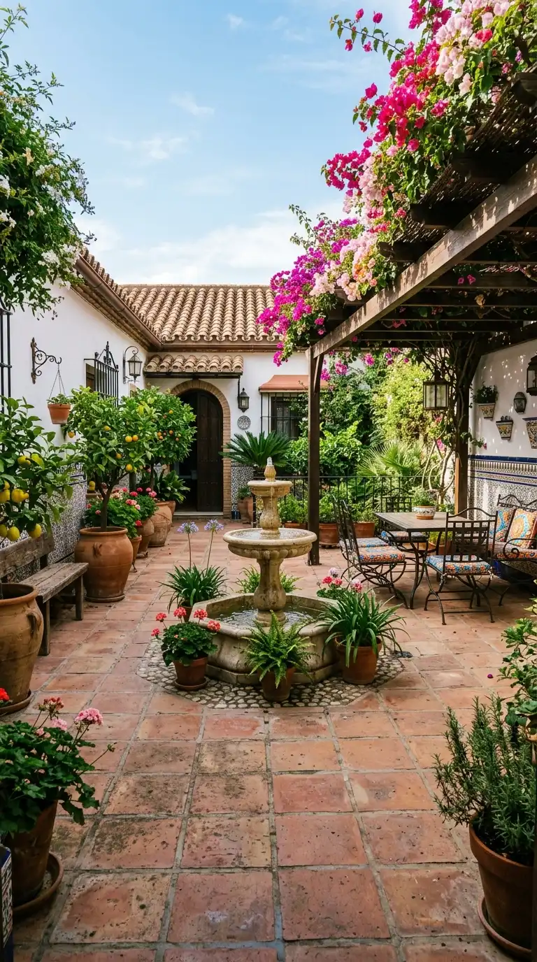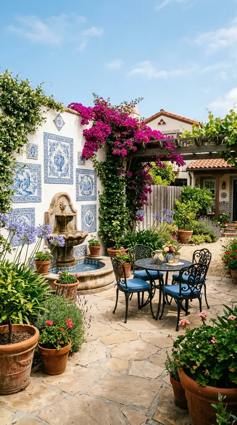 A Spanish courtyard, or patio, is designed for shade and relaxation. Use clay tile flooring, wrought iron furniture, and colorful ceramic tiles as accents. Add a central fountain or a small pool. Plant citrus trees, bougainvillea, and jasmine in large pots. Use a retractable awning or a pergola with climbing vines for shade. The atmosphere is warm, vibrant, and inviting.