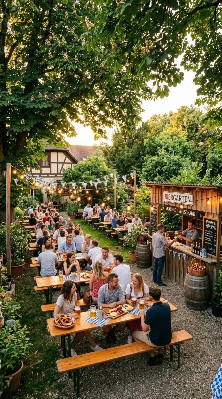 A German biergarten is a casual, communal space for outdoor dining and drinking. Use long wooden picnic tables with benches under the shade of chestnut or linden trees. Serve beer, pretzels, sausages, and potato salad. Add string lights and lanterns for evening ambiance. A biergarten is perfect for large gatherings and festive celebrations.