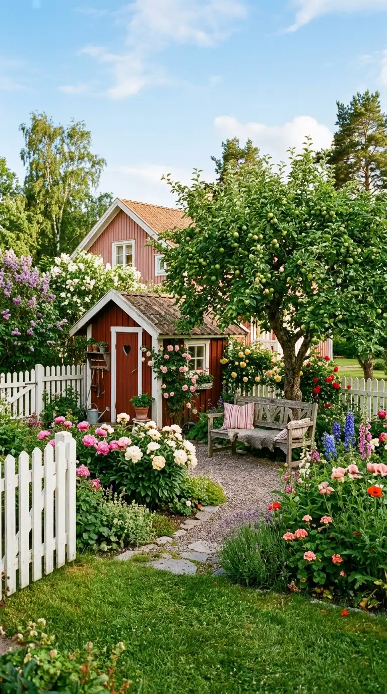 A Swedish cottage garden is charming, simple, and colorful. Plant a mix of perennials, annuals, and vegetables in a relaxed, informal layout. Use a white picket fence, a red wooden cottage or shed, and simple wooden furniture. Include classic Swedish plants like lilacs, peonies, roses, and apple trees. The atmosphere is cheerful and welcoming.