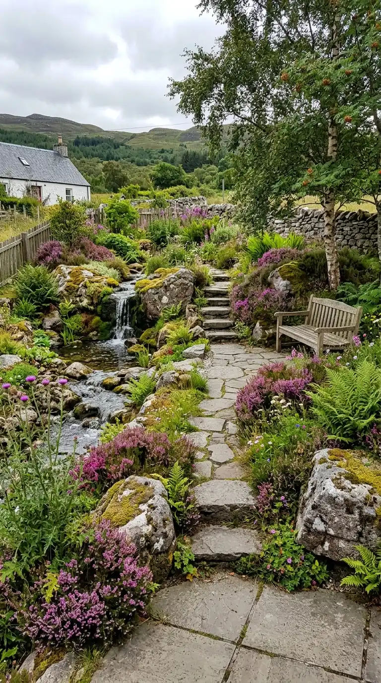 A Scottish Highland-inspired garden is wild, rugged, and natural. Use native plants like heather, thistle, ferns, and mosses. Add large boulders, a stone path, and a small waterfall or stream. Include a simple wooden bench or a stone circle for seating. The garden feels like a piece of the Highlands, perfect for quiet contemplation.