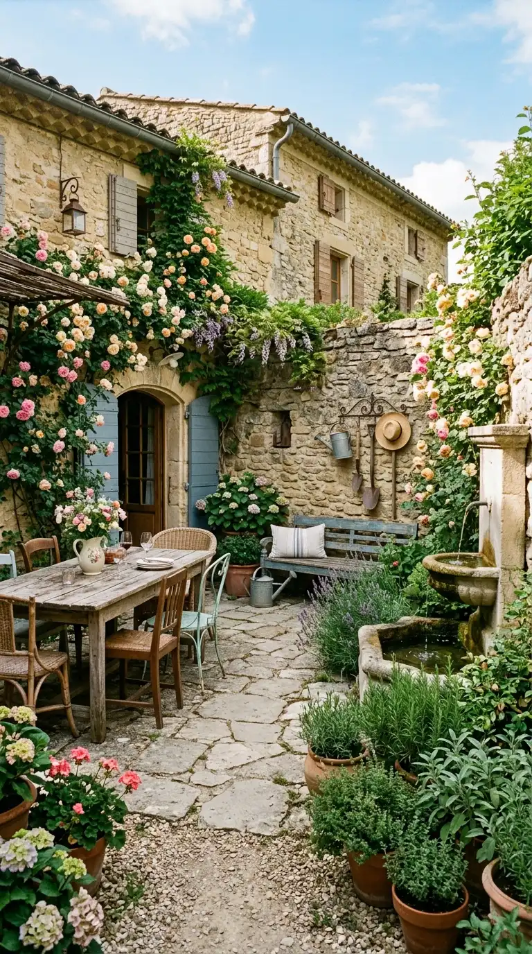 A French country courtyard is rustic, charming, and lived-in. Use stone or gravel flooring, a wooden table with mismatched chairs, and a simple stone fountain. Plant climbing roses, lavender, and herbs in pots and beds. Add a weathered bench, a birdhouse, and a few vintage garden tools as decor. The atmosphere is relaxed, personal, and full of character.