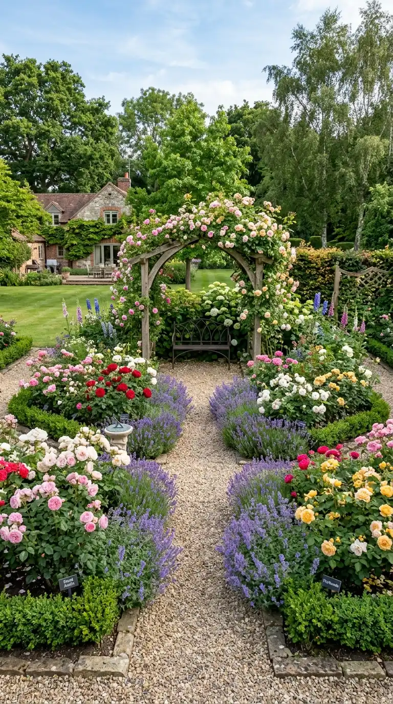 An English rose garden is dedicated to the queen of flowers. Plant a variety of rose species and cultivars—hybrid teas, floribundas, climbers, and old-fashioned shrub roses. Arrange them in formal beds or informal drifts, and add companion plants like lavender, catmint, and boxwood. Include an arch or arbor covered with climbing roses, and place a bench where you can sit and enjoy the fragrance.