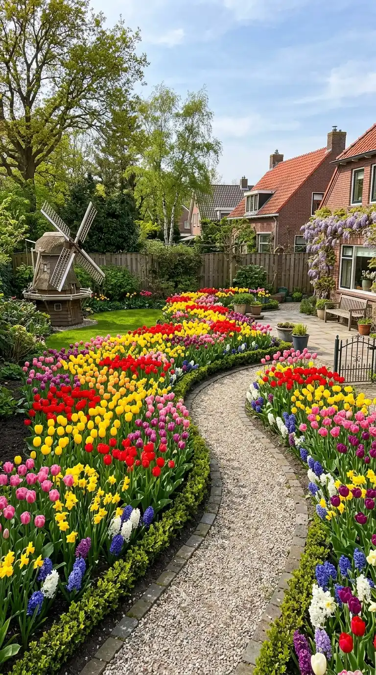 A Dutch tulip garden brings the vibrant colors of spring to your backyard. Plant tulip bulbs in large drifts or formal beds, using a single color for impact or a mix of complementary colors. Add other spring bulbs like daffodils, hyacinths, and crocuses for extended bloom time. A windmill or wooden bench adds a whimsical touch.