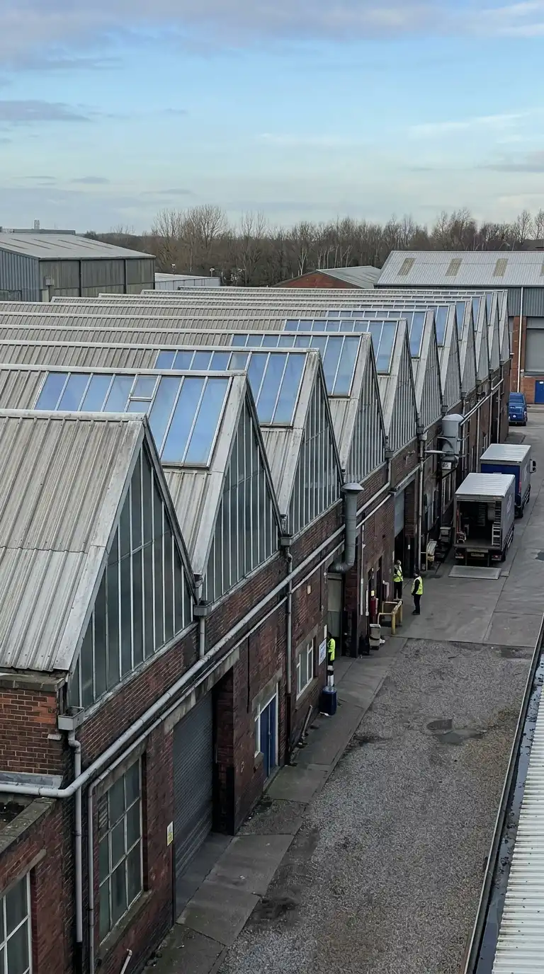 The monitor roof factory has a raised central section with vertical windows on both sides. The monitor roof provides light and ventilation. The monitor roof is like a sawtooth but symmetrical. The monitor roof factory is industrial, ventilated, and top-lit.