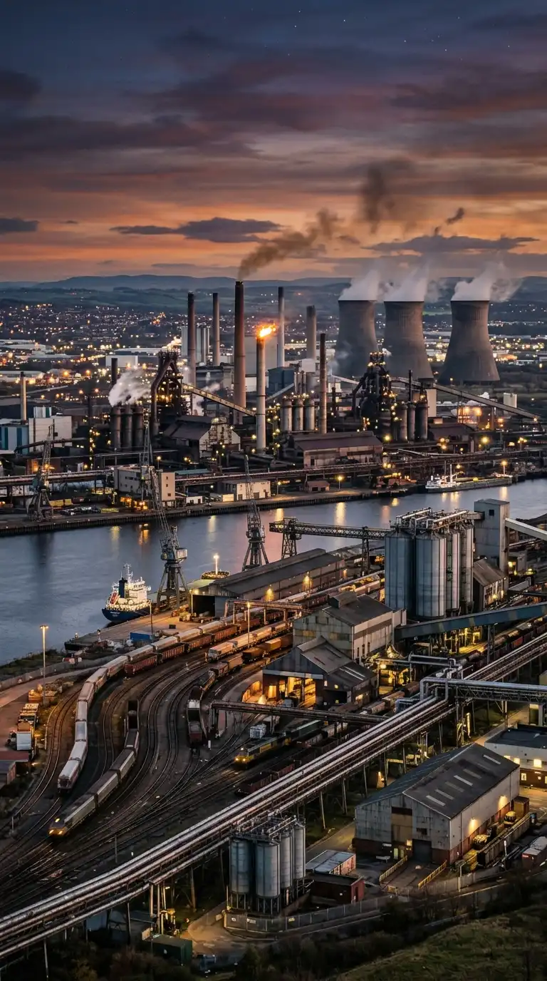 The industrial landscape is not a single building — it is a collection of buildings, structures, and infrastructure. Factories, smokestacks, cooling towers, silos, cranes, and railways. The industrial landscape is the skyline of production. It is monumental, layered, and industrial.