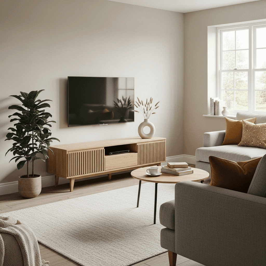 Use light-colored wooden slats for media consoles or room dividers. These vertical lines provide texture and a sense of architectural height without the “heaviness” of solid wood.