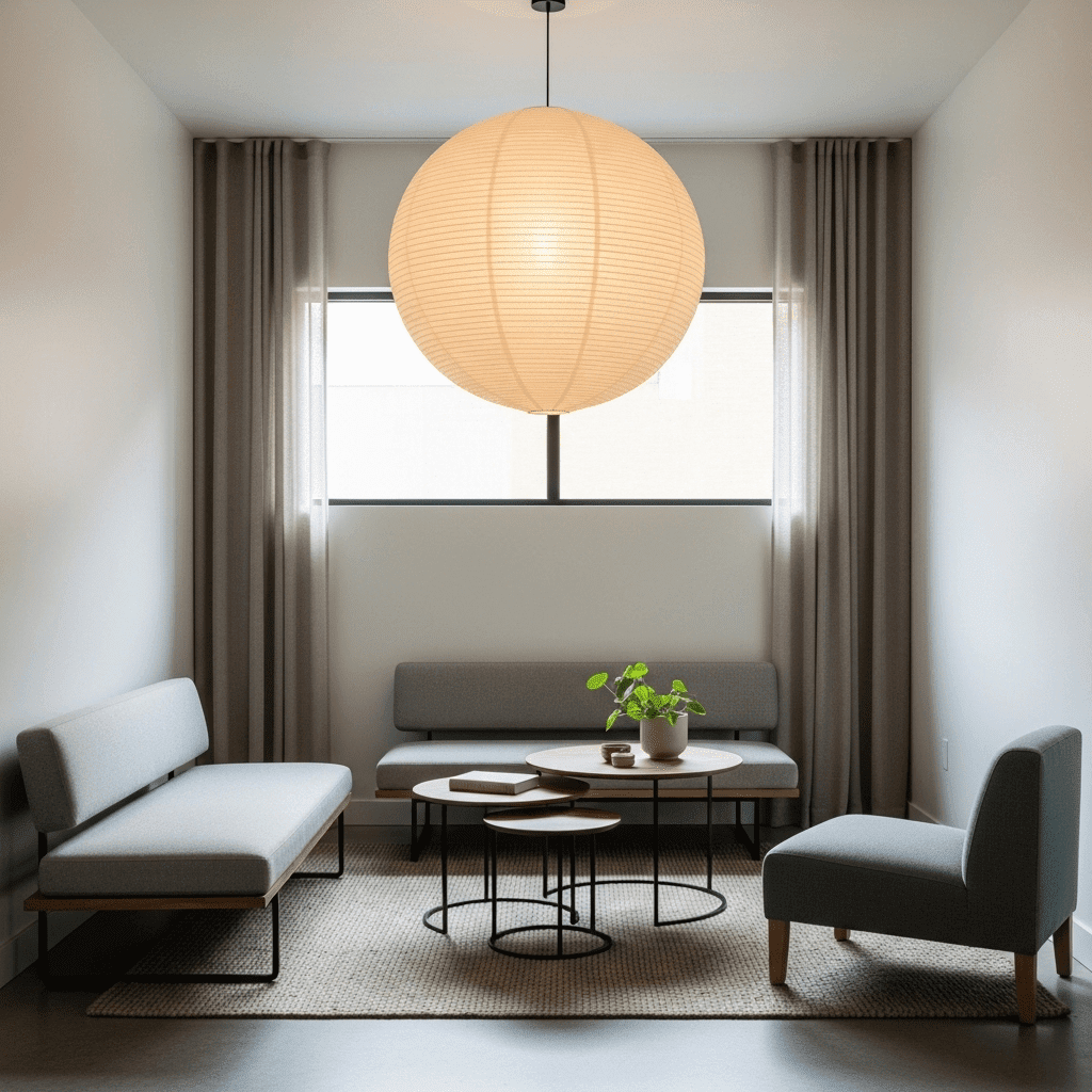 Replace heavy floor lamps with a large, sculptural rice paper pendant light (like an Akari style). These provide a soft, diffused glow that fills the room without occupying any floor space.