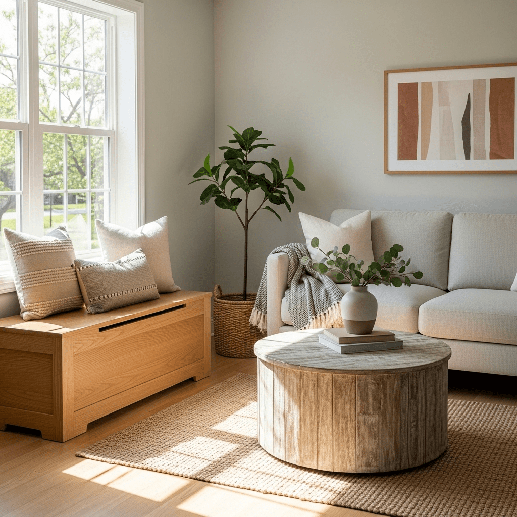Use minimalist wooden benches with hidden internal compartments. This provides extra seating for guests while keeping daily items like blankets or books tucked away and out of sight.