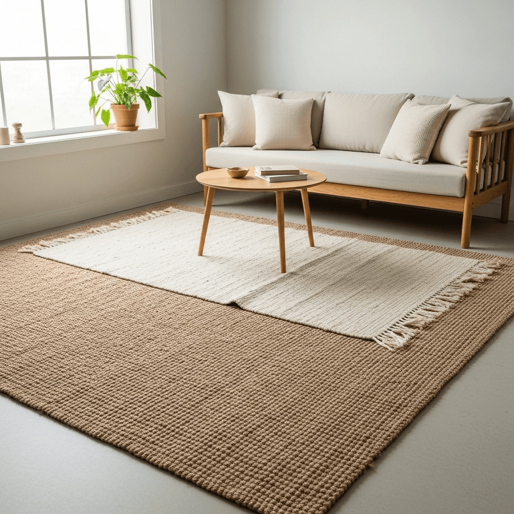 Layer a jute rug under a smaller wool rug. The combination of natural textures provides warmth and “hygge” comfort without requiring bold colors or patterns that shrink a space.