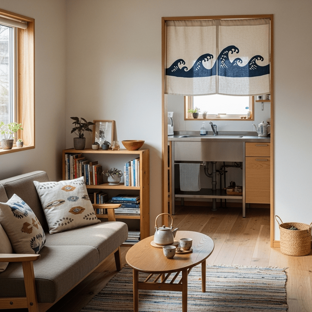 Use a fabric “Noren” (Japanese split curtain) to separate the living room from a kitchen or hallway. It provides a soft, flexible boundary that doesn’t block light or air.