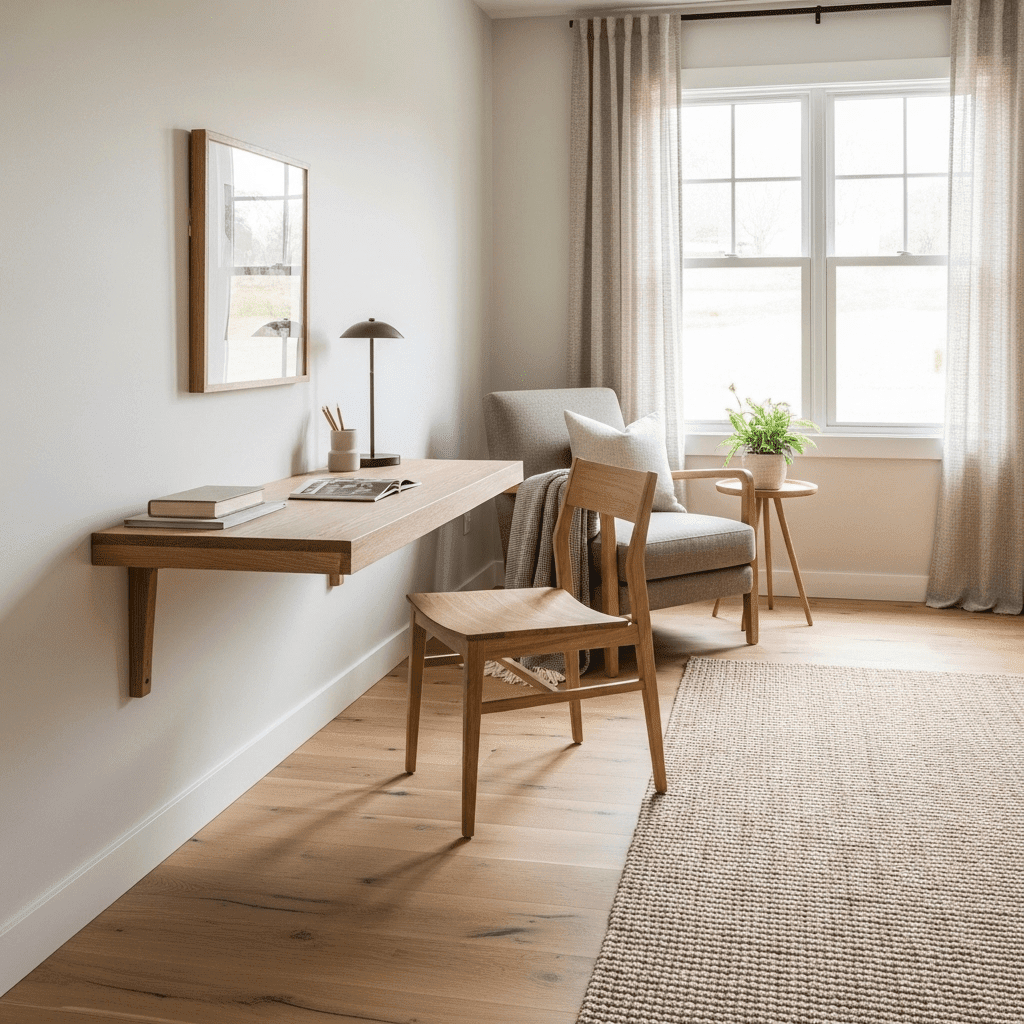 A shallow, floating wooden desk in a light finish can serve as a home office. Since it has no legs, the floor remains visible, maintaining the Japandi “open flow” concept.