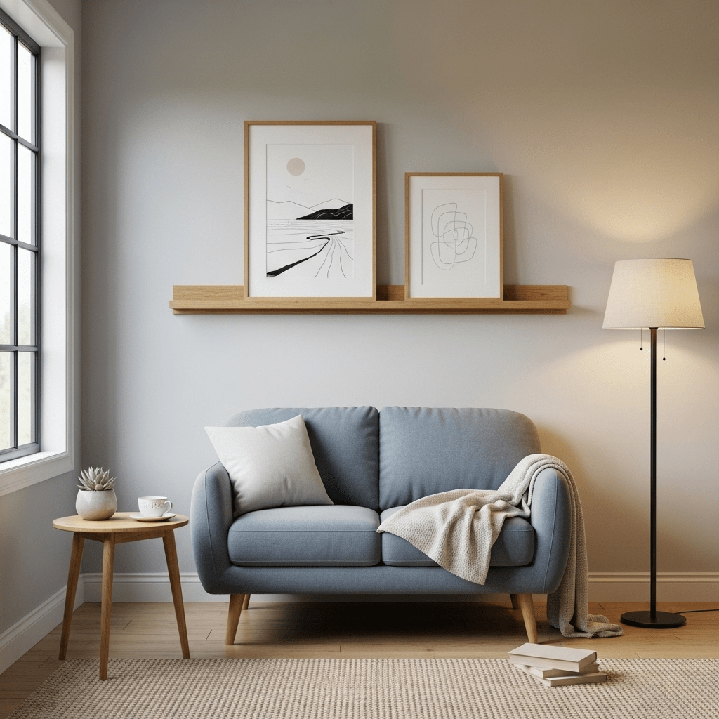 Instead of a scattered gallery wall, use a single long wooden picture ledge. This horizontal line organizes your art and prevents the walls from feeling “cluttered” or busy.