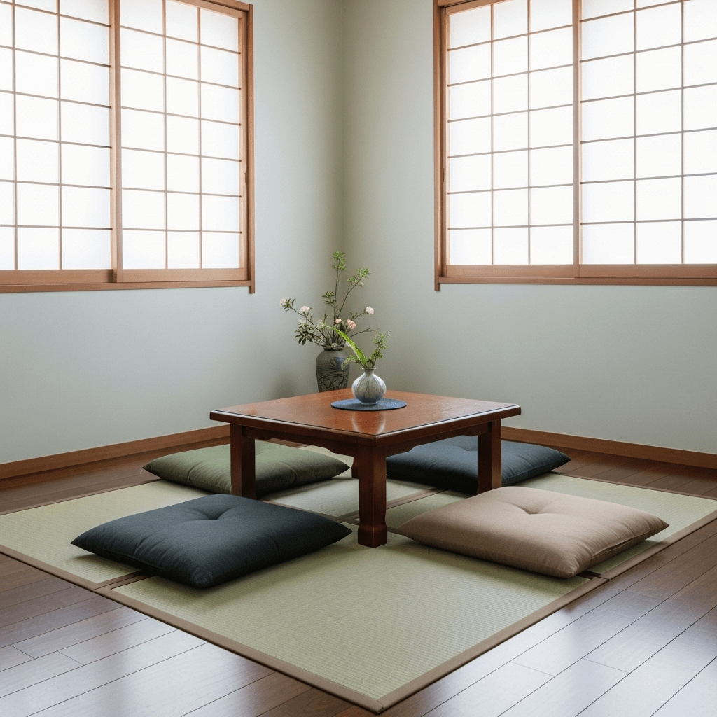 Use a tatami-style woven mat to define the “inner” lounge area. The grid-like structure of the mats provides a sense of order and geometry that is core to Japanese design.