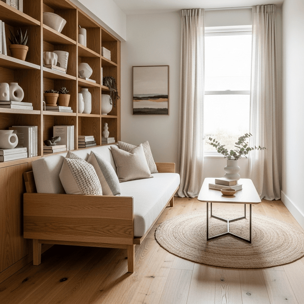 Use the same light, unfinished wood (like ash or bamboo) for your shelving, flooring, and furniture. This “mono-material” look creates a seamless environment that expands the room.