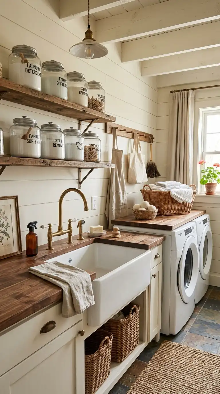 An apron-front or farmhouse sink brings rustic charm to a laundry room. The exposed front panel gives the sink a substantial, furniture-like appearance. Choose fireclay or enameled cast iron in white or cream. This sink works well in farmhouse, cottage, or vintage-inspired laundry rooms.