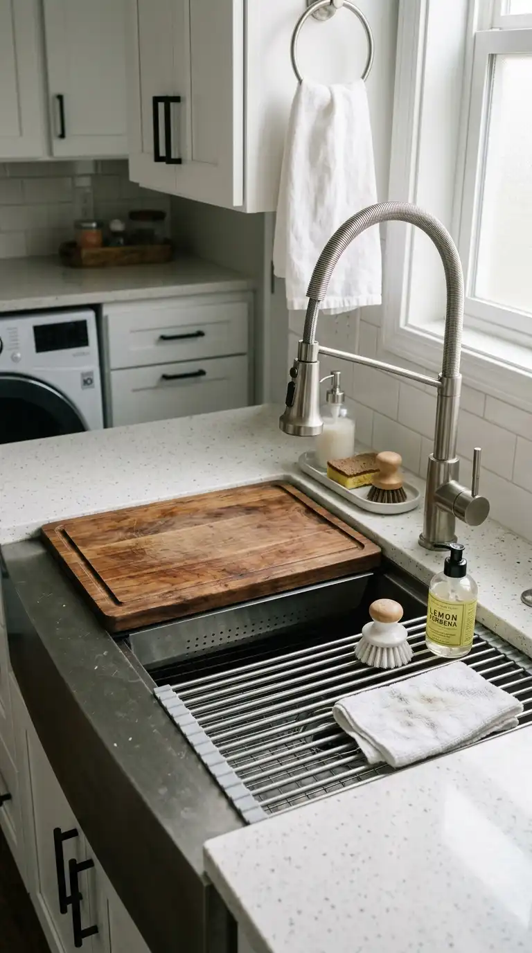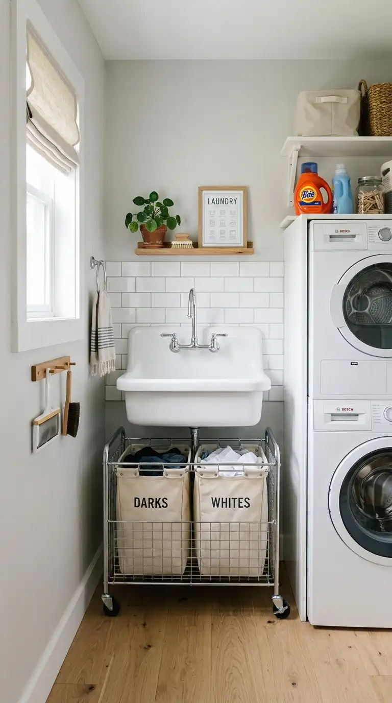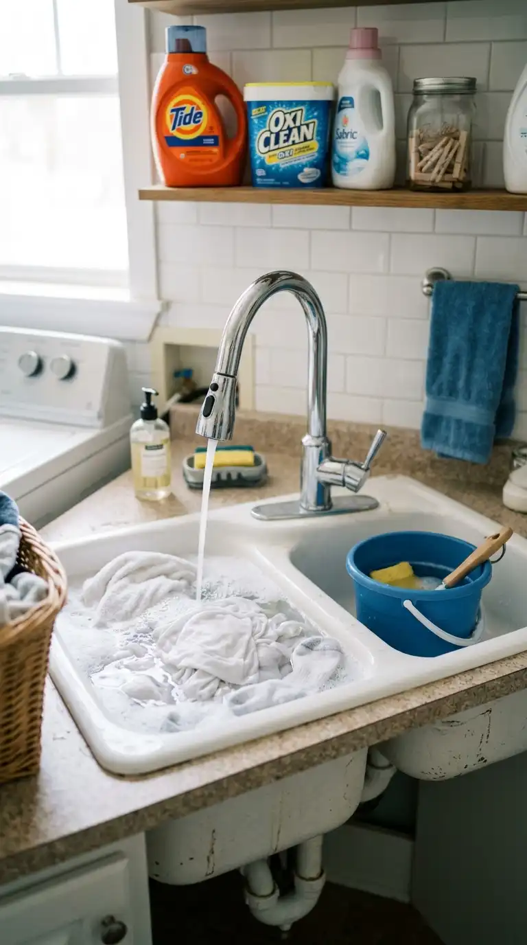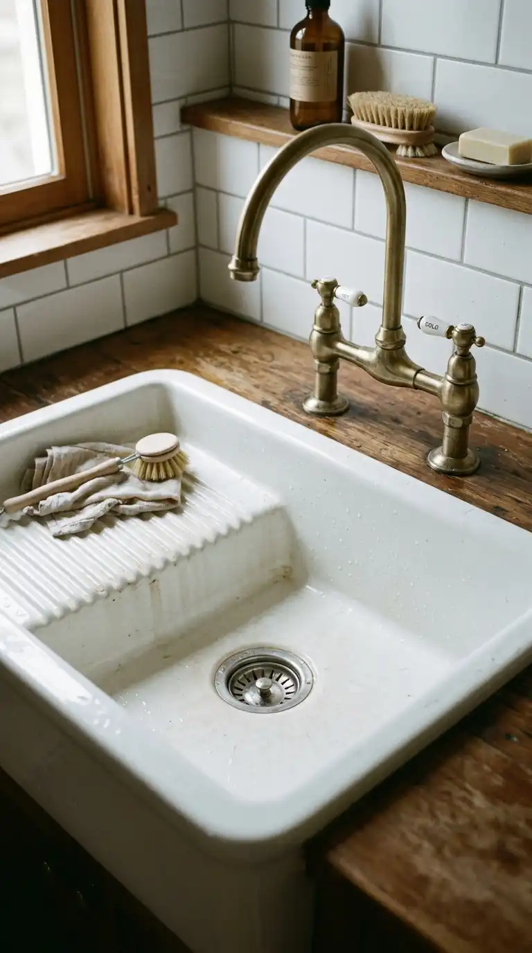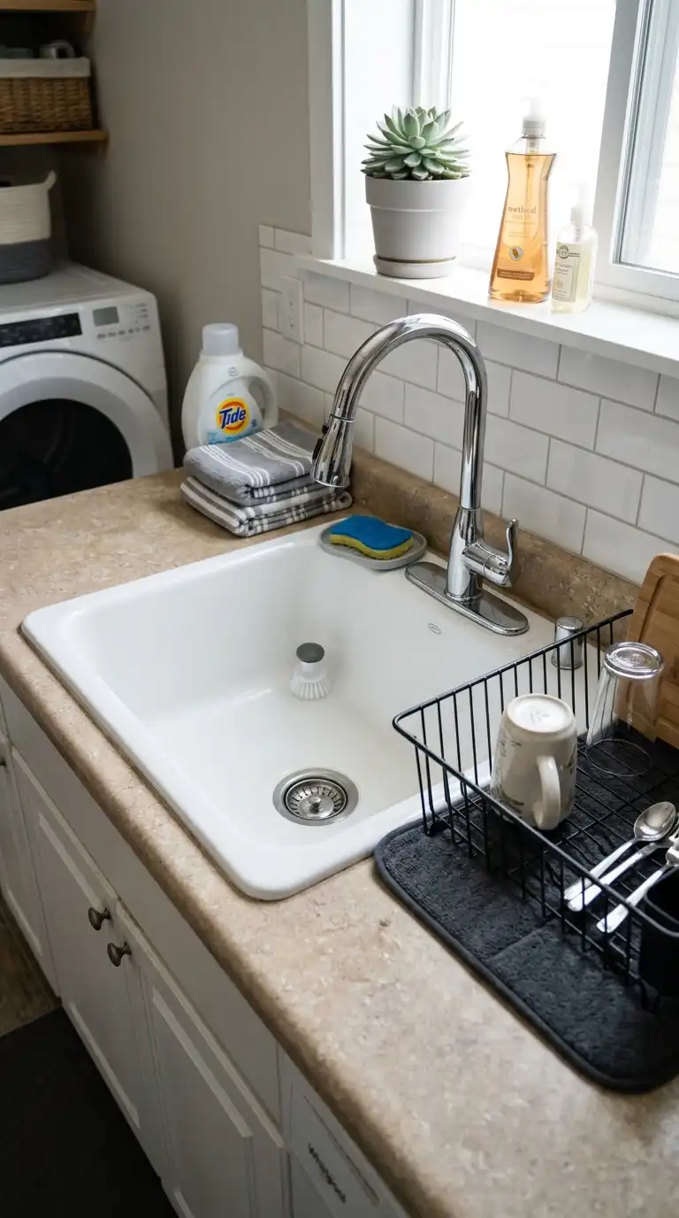 For a vintage touch, install a utility sink with an integrated washboard. The ribbed surface on one side of the sink is perfect for hand-scrubbing stains. This style is both functional and nostalgic. Look for a fireclay or cast iron sink with a built-in washboard area.