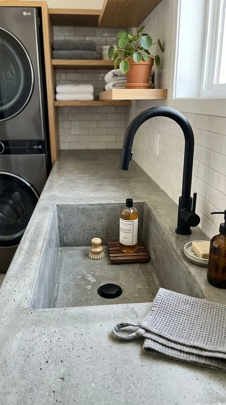 A concrete utility sink adds an industrial, modern touch. Concrete is extremely durable and can be cast into any shape. It develops a natural patina over time. Seal the concrete to prevent staining. This sink works well in contemporary or industrial-style laundry rooms.