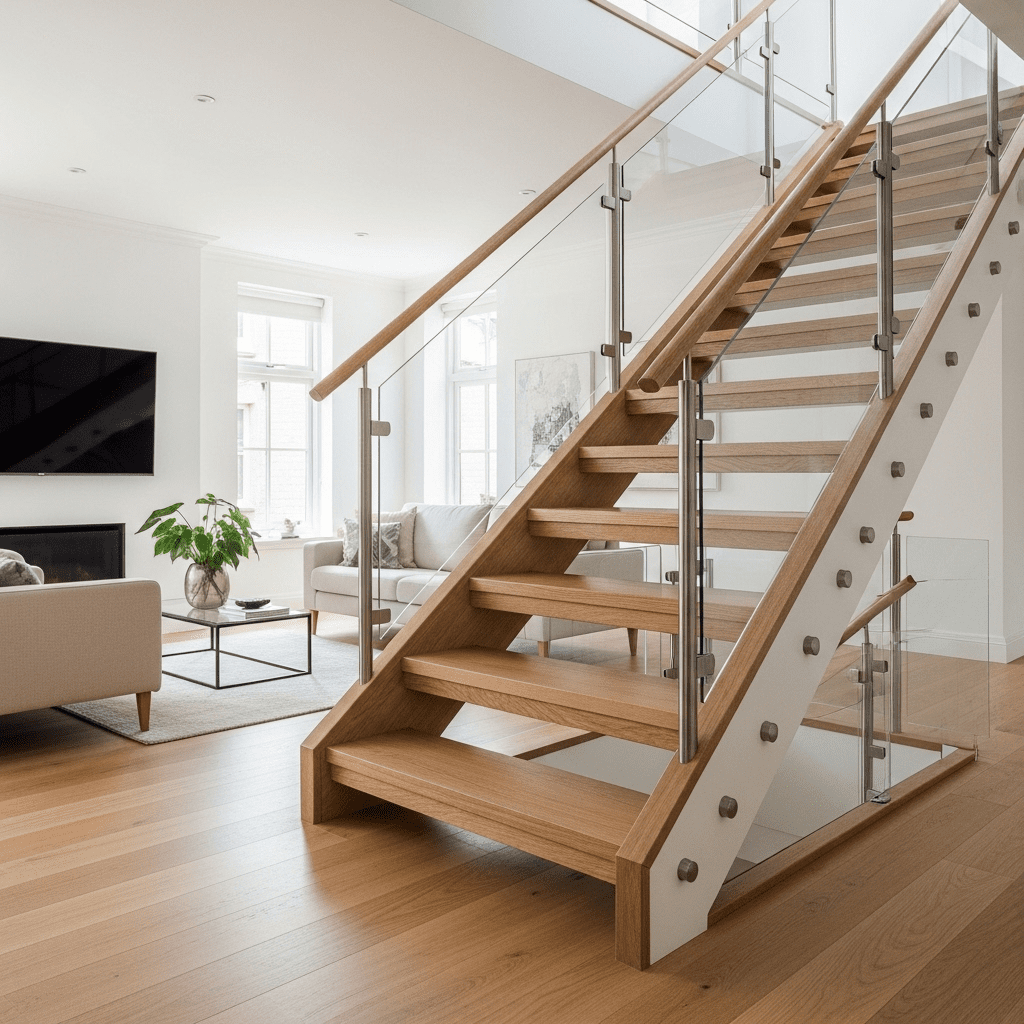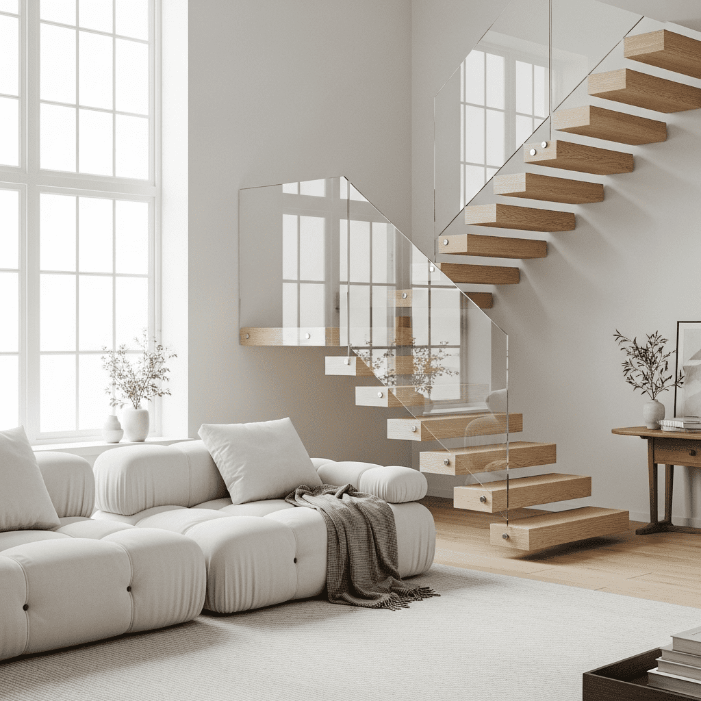 Featuring thick oak treads anchored directly into the wall with no visible risers or bulky railings. This creates a “see-through” effect that keeps the living room feeling open and light.