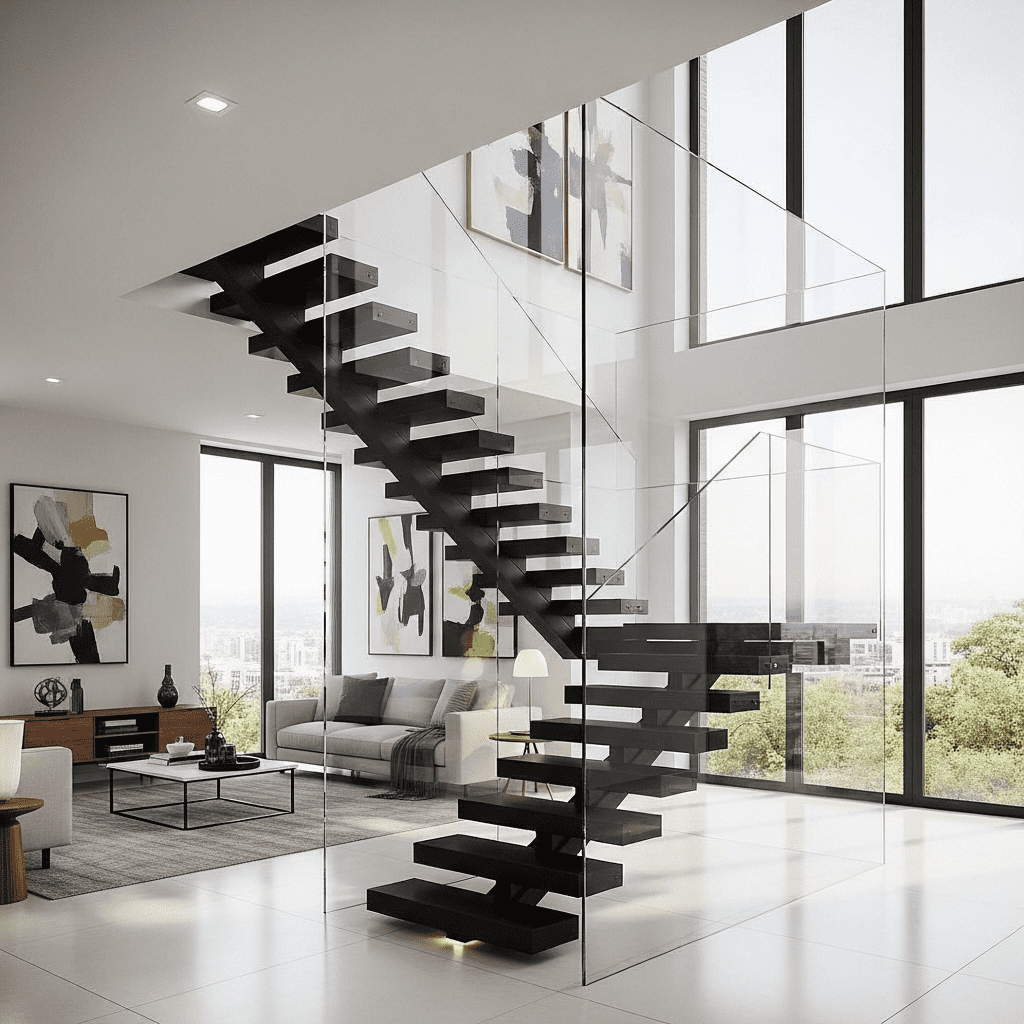 Enclosing the staircase in floor-to-ceiling glass panels. This keeps the stairs safe and quiet while allowing them to remain a primary visual element of the room.