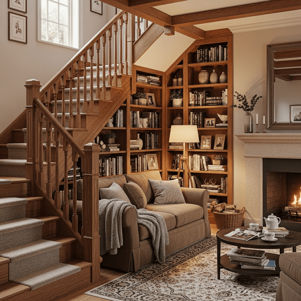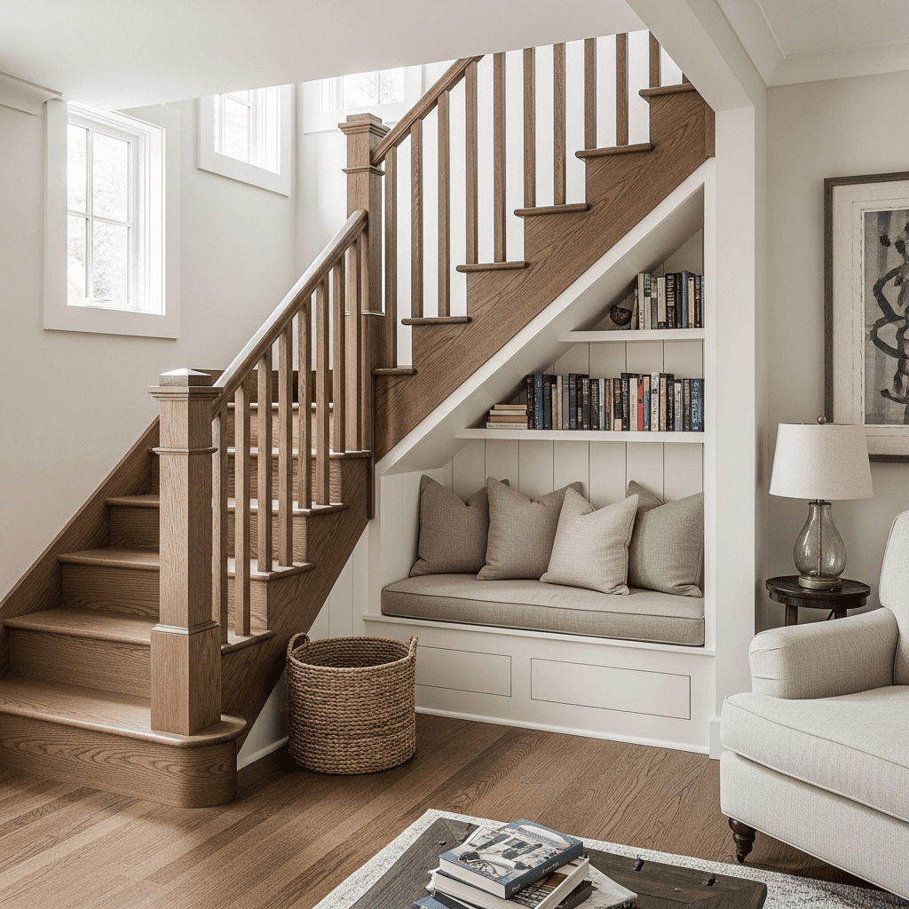 Creating a cozy, built-in reading bench or a small “playroom” under the stairs, complete with soft lighting and plush cushions.