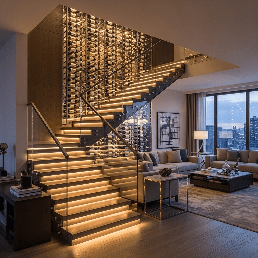 Transforming the often-wasted space beneath the stairs into a luxury climate-controlled wine display with glass doors.