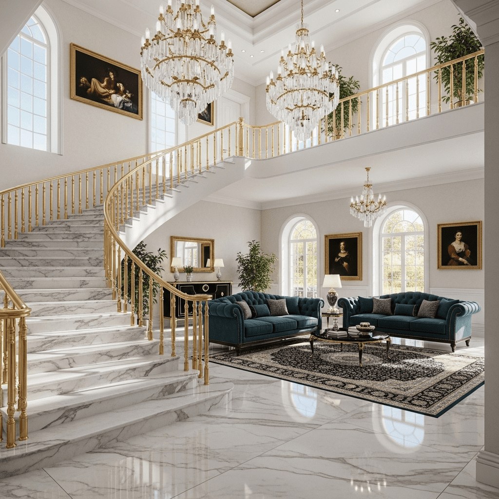 A high-luxury approach featuring a curved staircase clad in white marble. This creates a sense of “Old Hollywood” glamour and architectural drama.