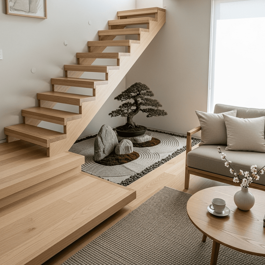 Incorporating a small indoor garden—think white river stones and a single tree—at the base of the stairs to create a peaceful transition point.
