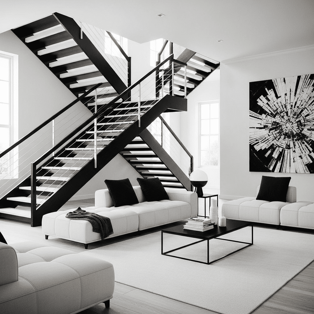 Painting the treads black and the risers white (or vice versa) to create a sharp, graphic “stair-step” pattern that draws the eye upward.
