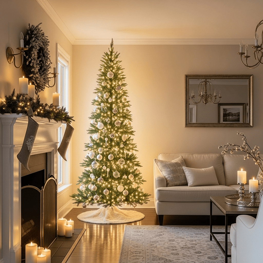 Choose a pencil-style Christmas tree (4-5 feet wide) that provides height without consuming floor space.
