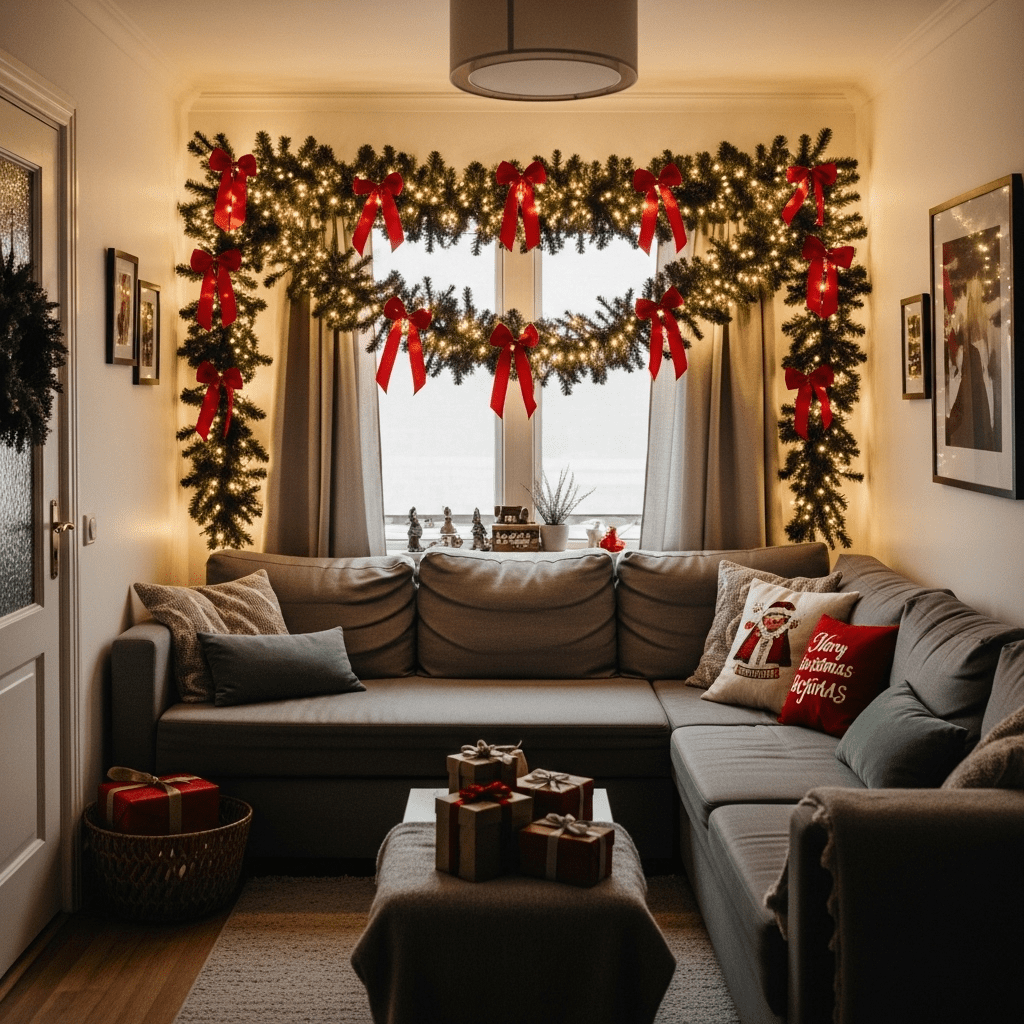 The lights create festive ambiance while highlighting your windows. Use warm white or colored lights depending on your style. This adds sparkle without consuming any floor space.