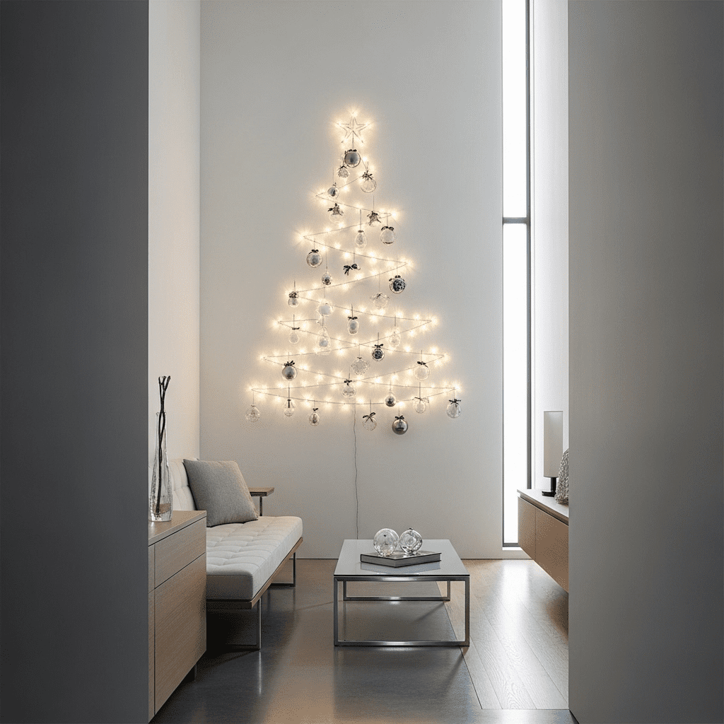 Create a wall-mounted tree alternative using lights, garland, or wooden dowels arranged in tree shape.