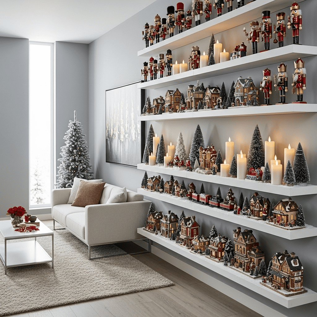 Arrange nutcrackers, snow globes, miniature trees, and candles on shelves. This vertical display adds holiday spirit without cluttering surfaces. Rotate items throughout the season for fresh looks.