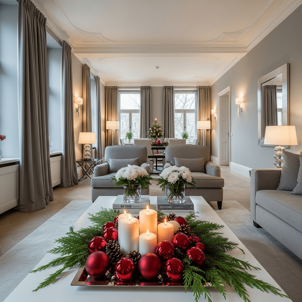 Use a tray filled with candles, ornaments, pinecones, and greenery. Keep it low-profile so it doesn’t obstruct conversation. Change elements weekly for variety throughout the season.