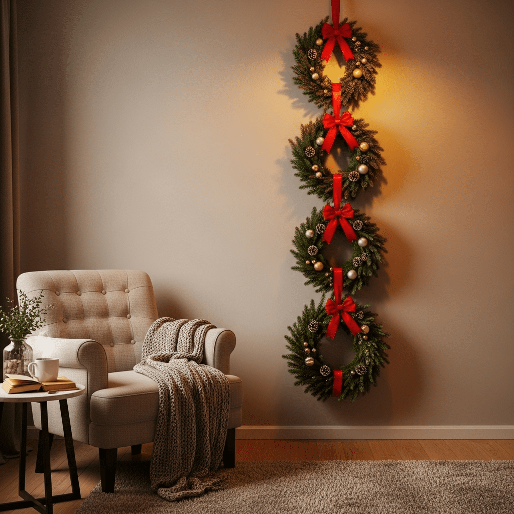 Stack three graduated wreaths or arrange several same-sized wreaths in a vertical line. Add ribbon between them. This creative alternative provides festive impact while using wall space instead of floor space.