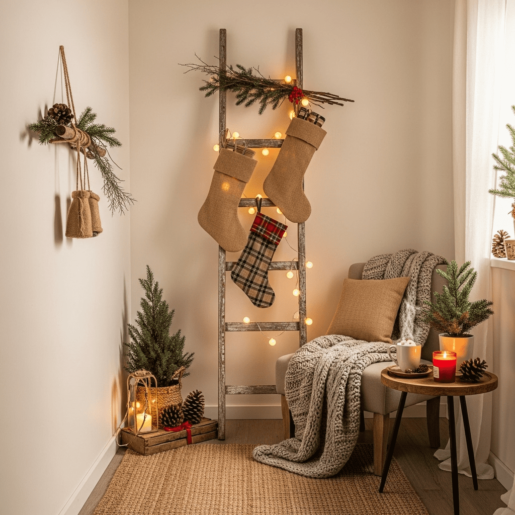 This farmhouse-style display is both festive and space-efficient. Add fairy lights wrapped around the ladder. The vertical display works perfectly in narrow rooms.