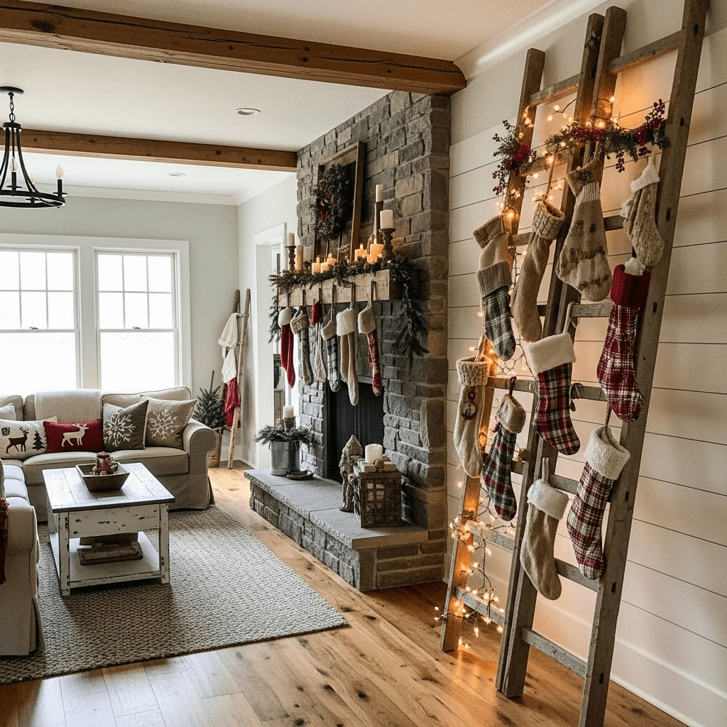Lean a decorative ladder against the wall and hang stockings from the rungs.