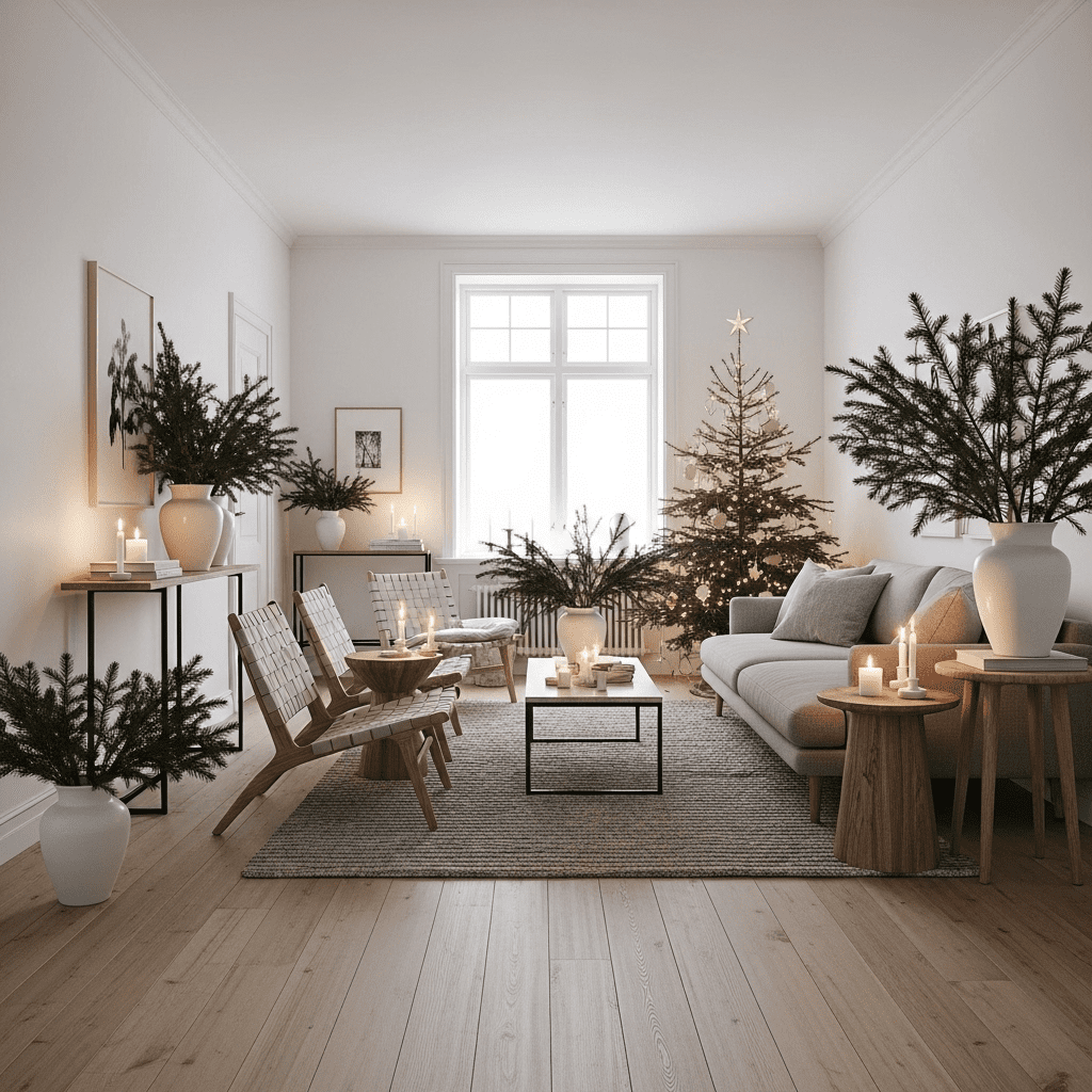 Embrace minimal Scandinavian Christmas decor with simple greenery, white, and natural wood.