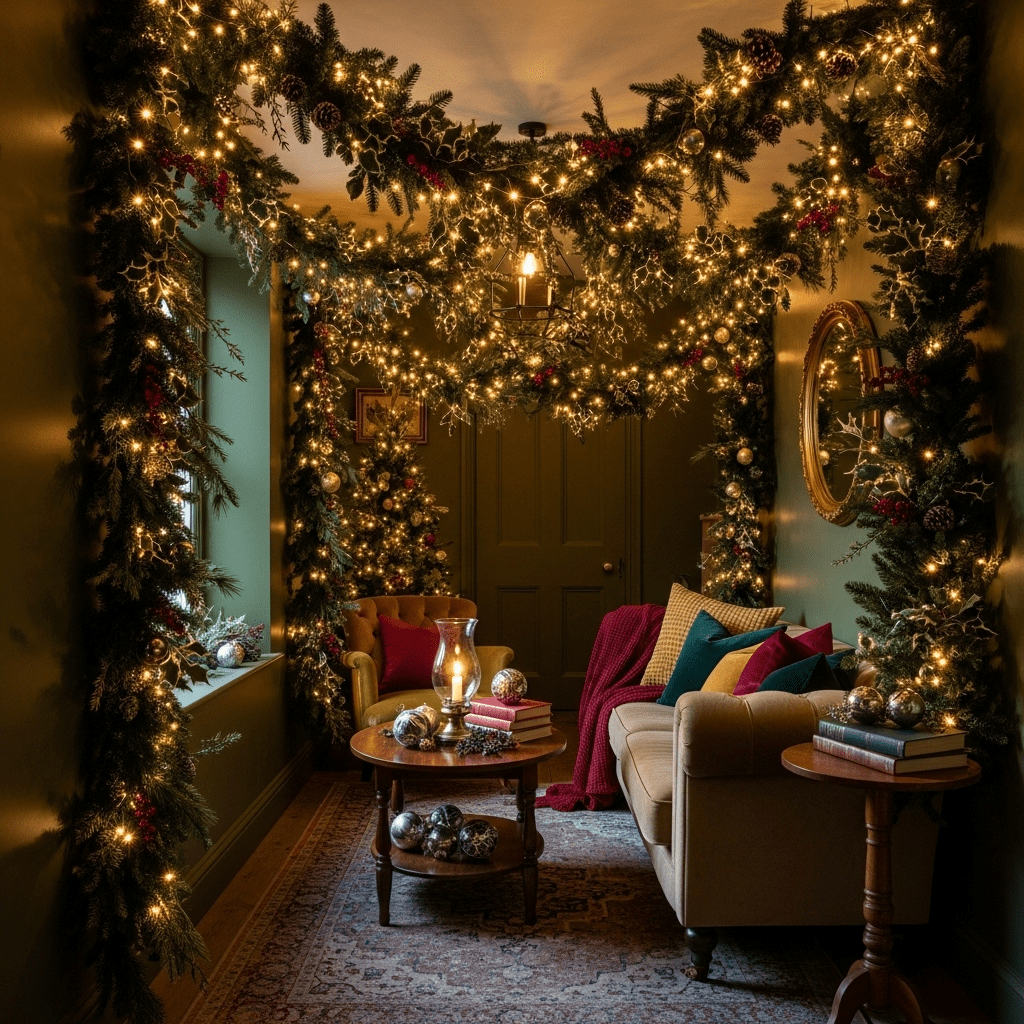 Drape evergreen garland with lights from ceiling hooks or a curtain rod. The overhead decoration adds festivity without touching walls or furniture. Creates a magical canopy effect.