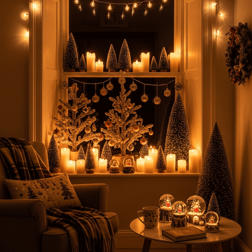 Arrange miniature trees, snow globes, ornaments, and LED candles along window sills. Natural light illuminates them during the day, and candles glow at night. Uses space that’s often overlooked.