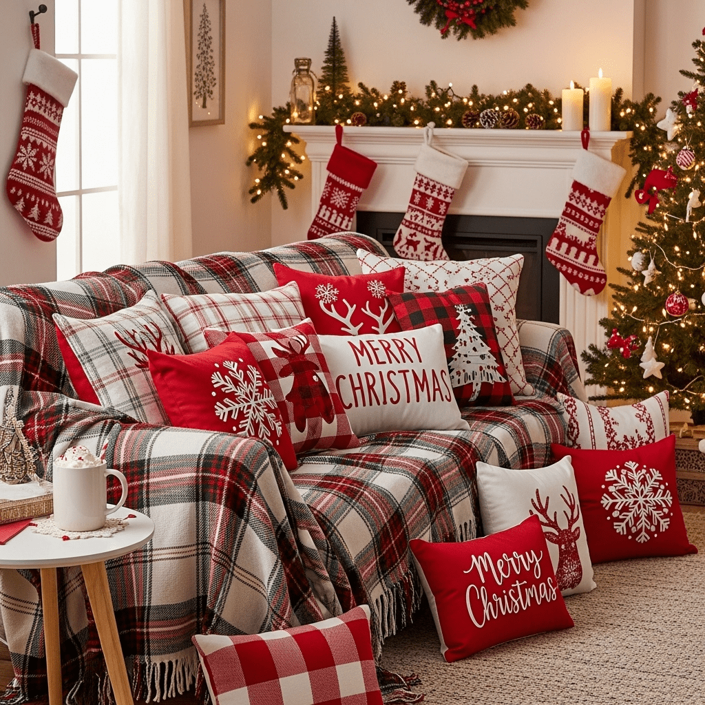Simply swap regular throw pillows for Christmas-themed ones in festive colors.