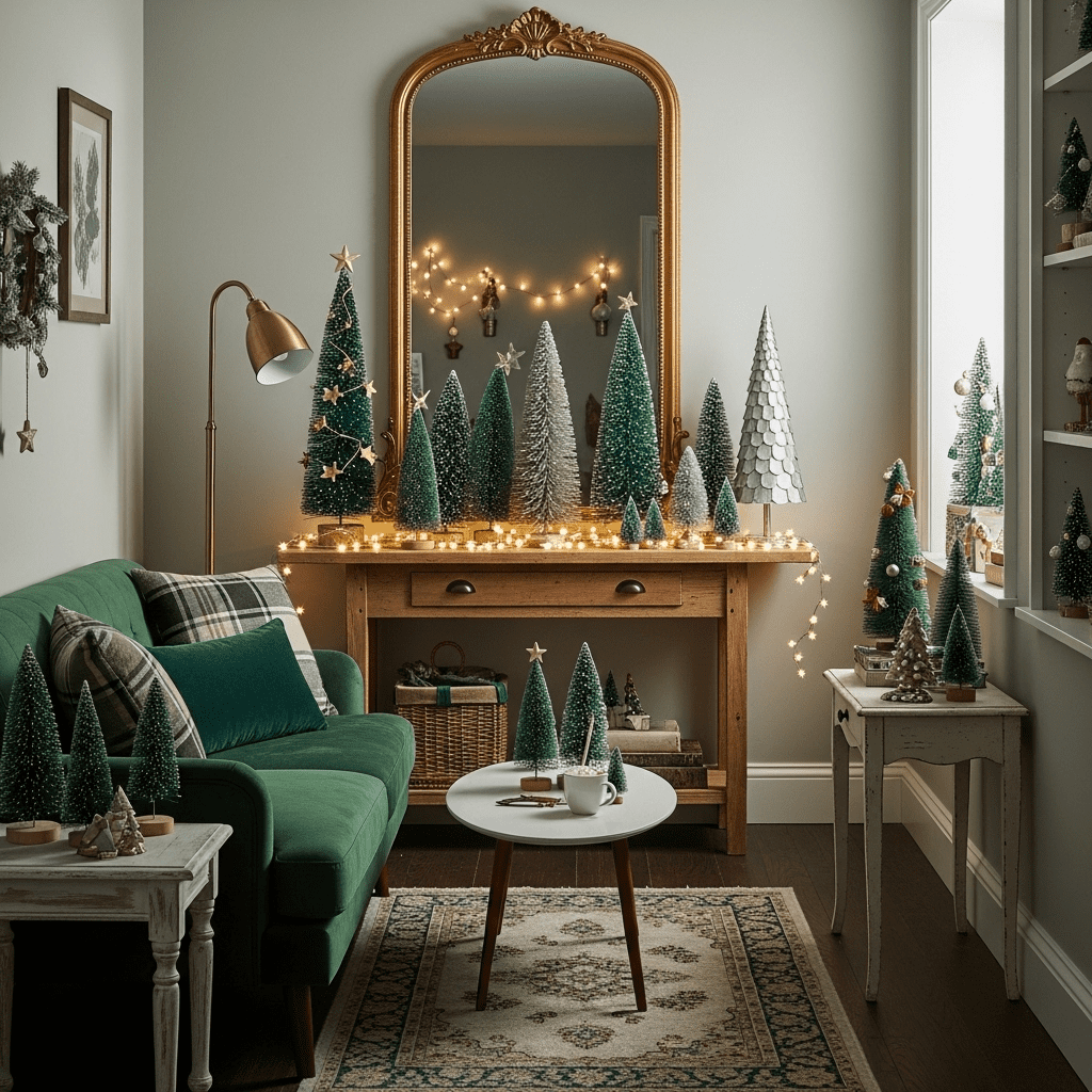 Use various sizes and styles—frosted, flocked, bottlebrush—creating a forest effect. These mini trees add festivity without the footprint of a full-size tree. Perfect for narrow spaces.