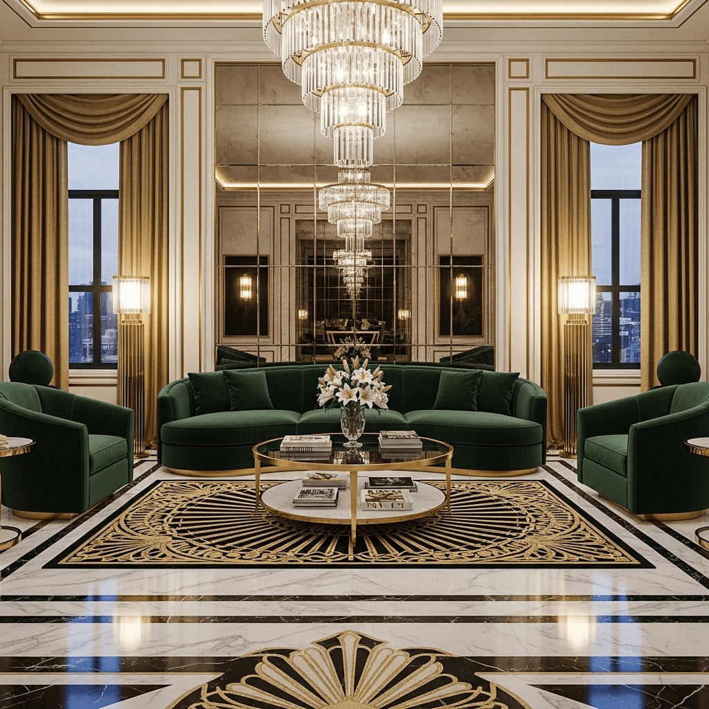 Capture the opulence of the 1920s with geometric patterns, mirrored surfaces, and luxurious materials. Think velvet sofas in rich navy or emerald, brass accents, and marble coffee tables. The symmetry and bold contrast create a space that’s both dramatic and refined.