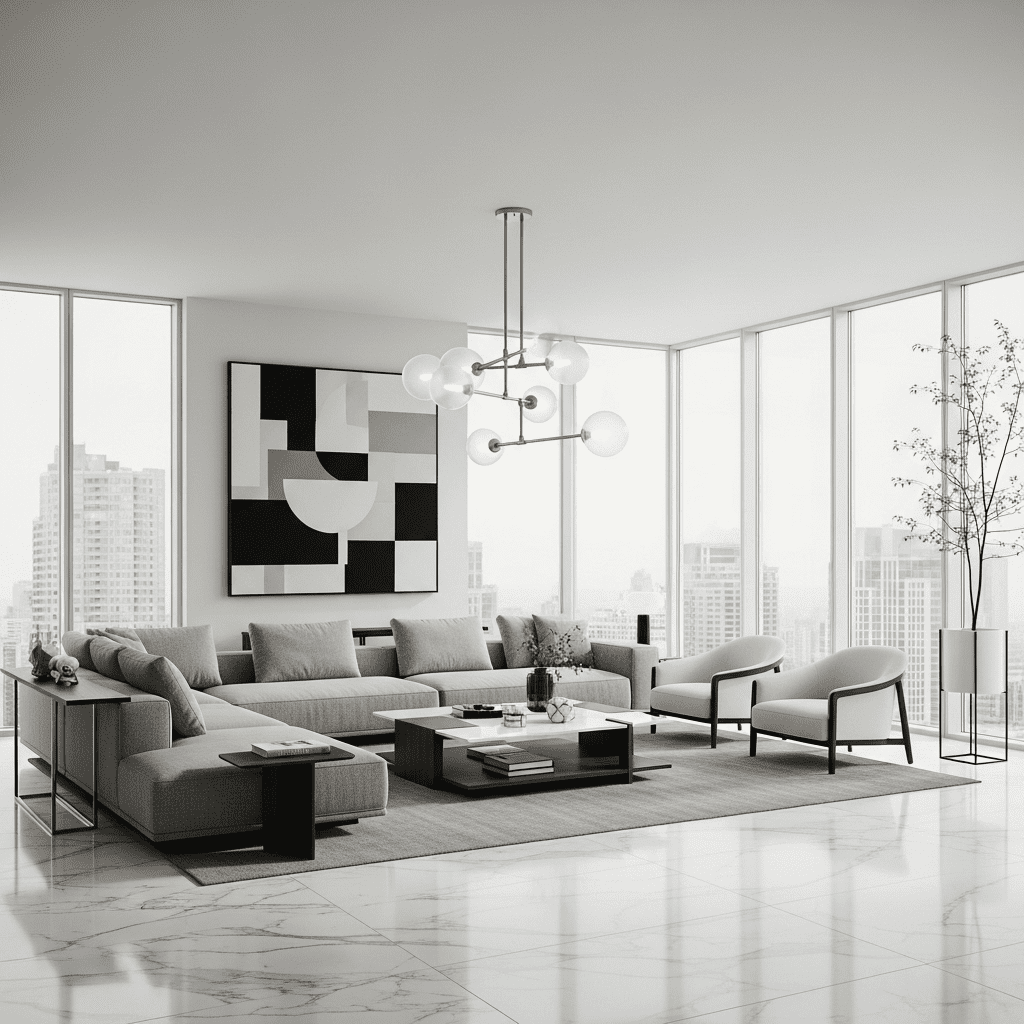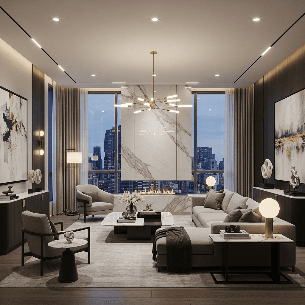 Floor-to-ceiling windows showcasing city views, sleek furniture, and a sophisticated color palette define metropolitan luxury. Incorporate high-tech features and designer pieces for modern elegance.