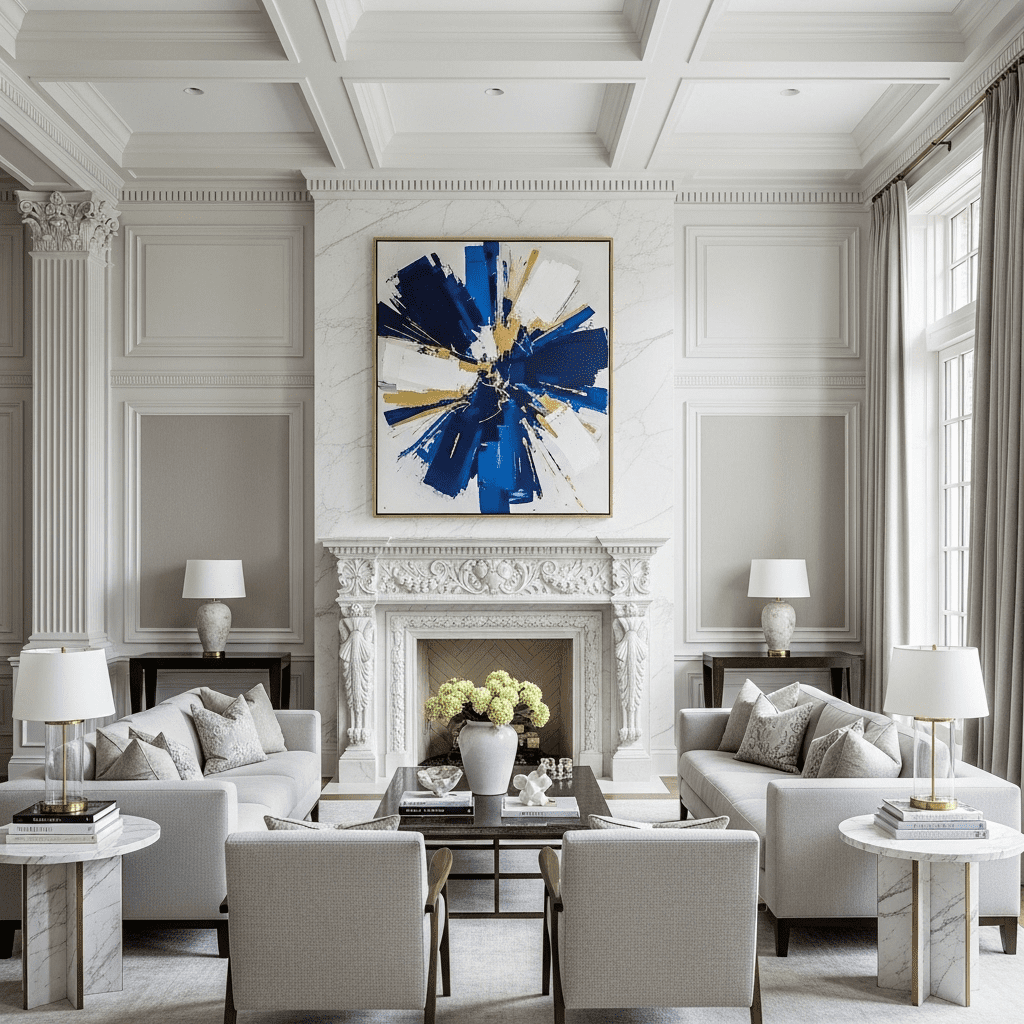Blend classical architecture with contemporary furnishings for a fresh take on timeless luxury. Ionic columns, coffered ceilings, and marble fireplaces pair beautifully with sleek modern furniture and abstract art.