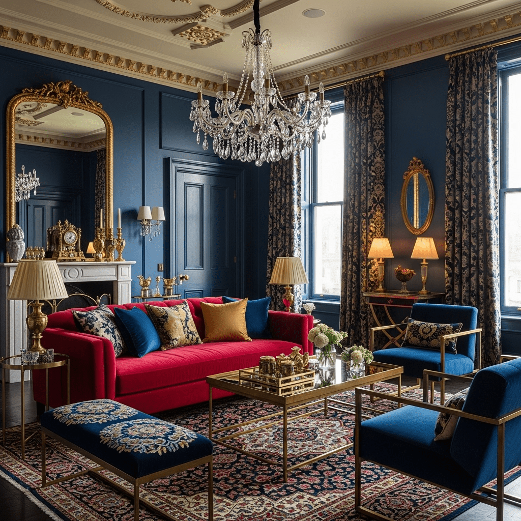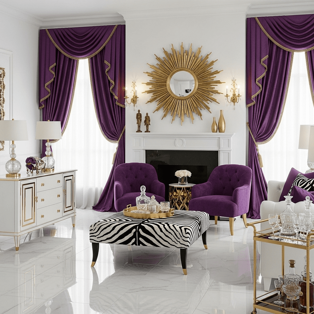 Bold patterns, metallic finishes, and theatrical flair define this glamorous style. Lacquered furniture, animal prints used sparingly, and statement mirrors create a space worthy of old Hollywood stars.